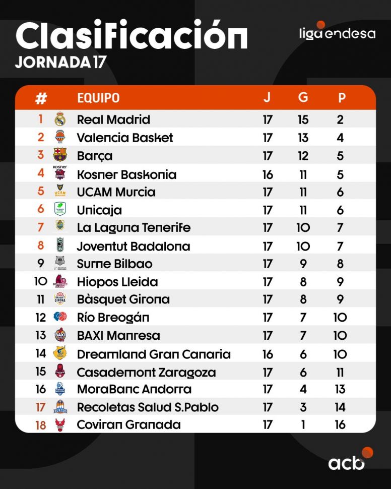 Gran Canaria (6-10) sigue en una temporada sumamente gris. Cayó de local ante Valencia 90 - 80 y se mantiene fuera de los puestos de playoffs. El alero santafesino Nicolás Brussino cerró con 8 pts, 3 rebotes, 1 recupero y 1 pérdida en 15 minutos.